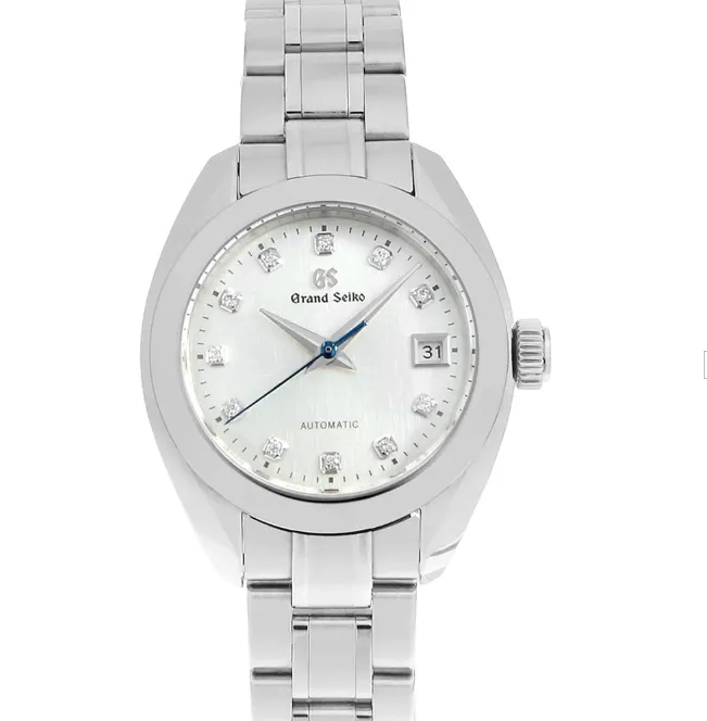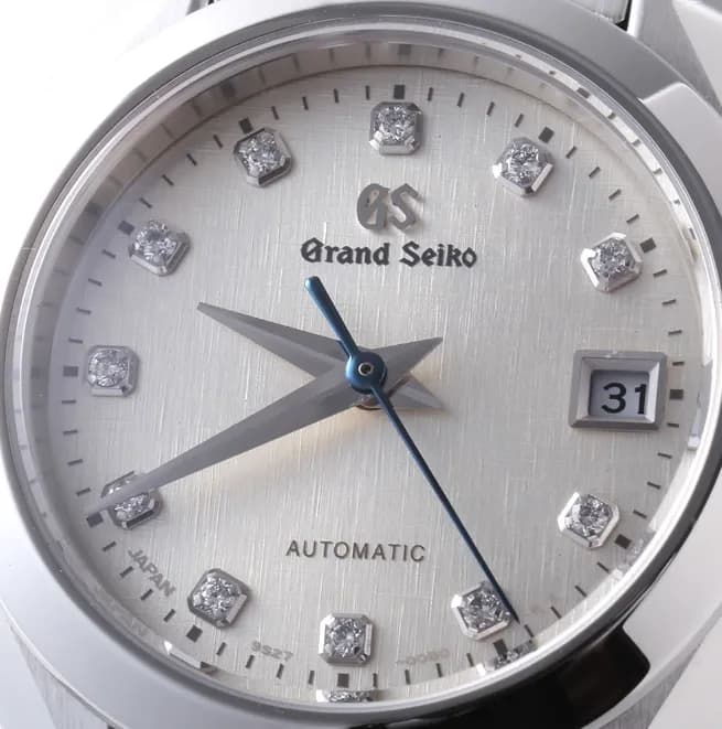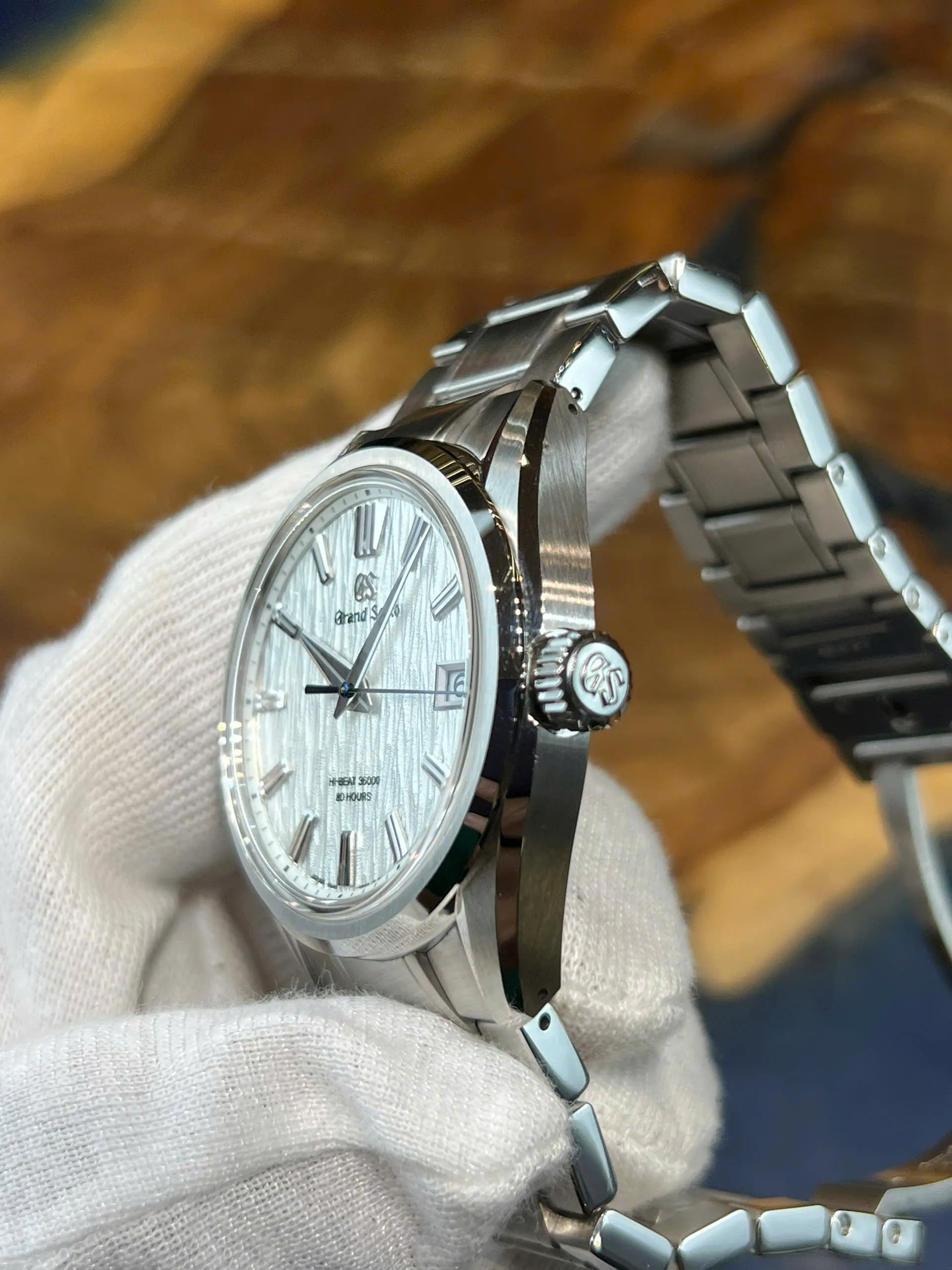 Presenting the Grand Seiko SBGR002, a distinguished timepiece featuring a polished gold case and gold dial with distinctive baton markers. The watch is complemented by a refined black leather strap and a gold tang buckle. Boasting sapphire crystal protection and an automatic movement, this exquisite wristwatch is in excellent pre-owned condition with no noticeable scratches. The date window at 3 o’clock adds a practical touch to its elegant design. Complete with box and papers, this splash-resistant watch is perfect for the discerning gentleman seeking timeless sophistication.