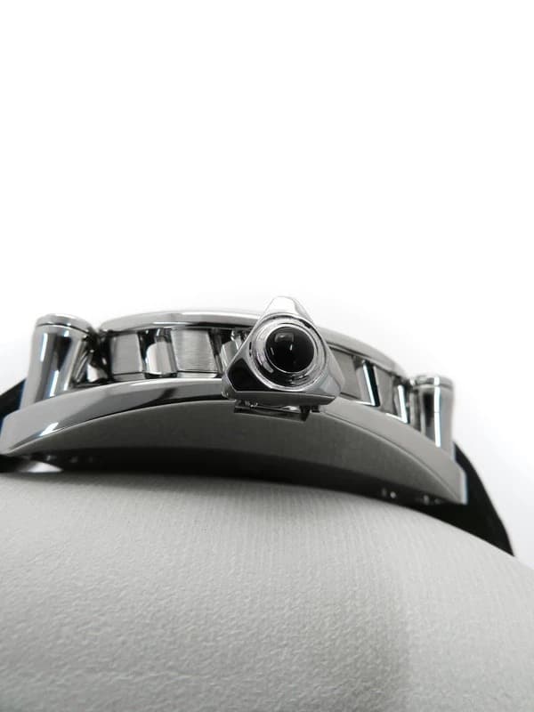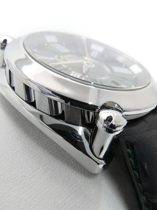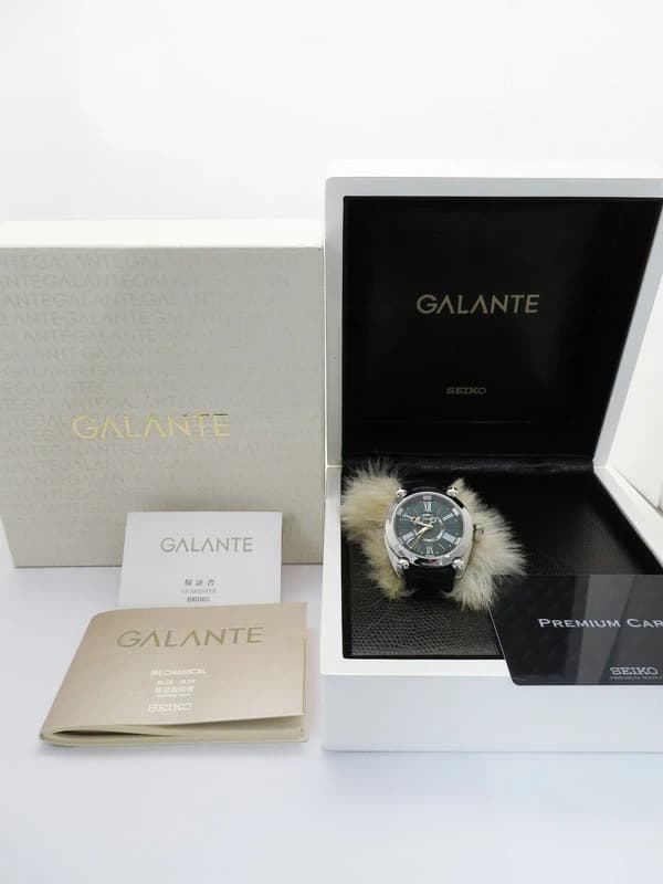 Experience the refined elegance of the Seiko Galante SBLM007, featuring a captivating emerald green dial adorned with Roman numeral markers and a distinctive gold GMT hand. Encased in polished stainless steel with four screw accents, this 44mm timepiece pairs a black leather strap with green stitching and a folding clasp for a sophisticated finish. • Polished stainless steel case, 44mm diameter with fixed bezel • Emerald green dial with Roman numeral markers and date window at 6 o’clock • Automatic movement with date and GMT complications • Black leather strap with green stitching and folding clasp • Sapphire crystal and solid caseback with crown featuring black cabochon This pre-owned watch is in excellent condition, showing no visible scratches and ready for immediate wear.