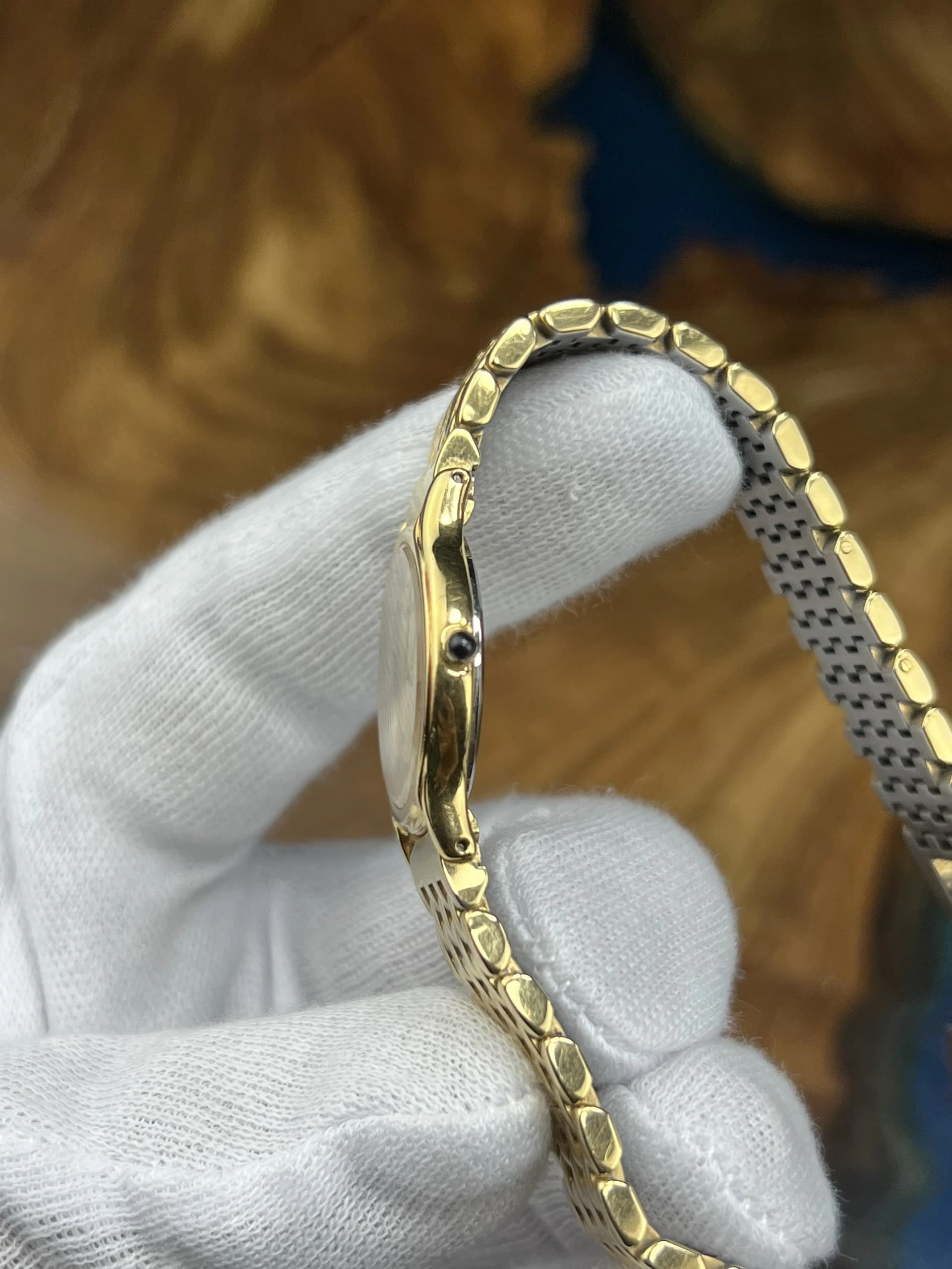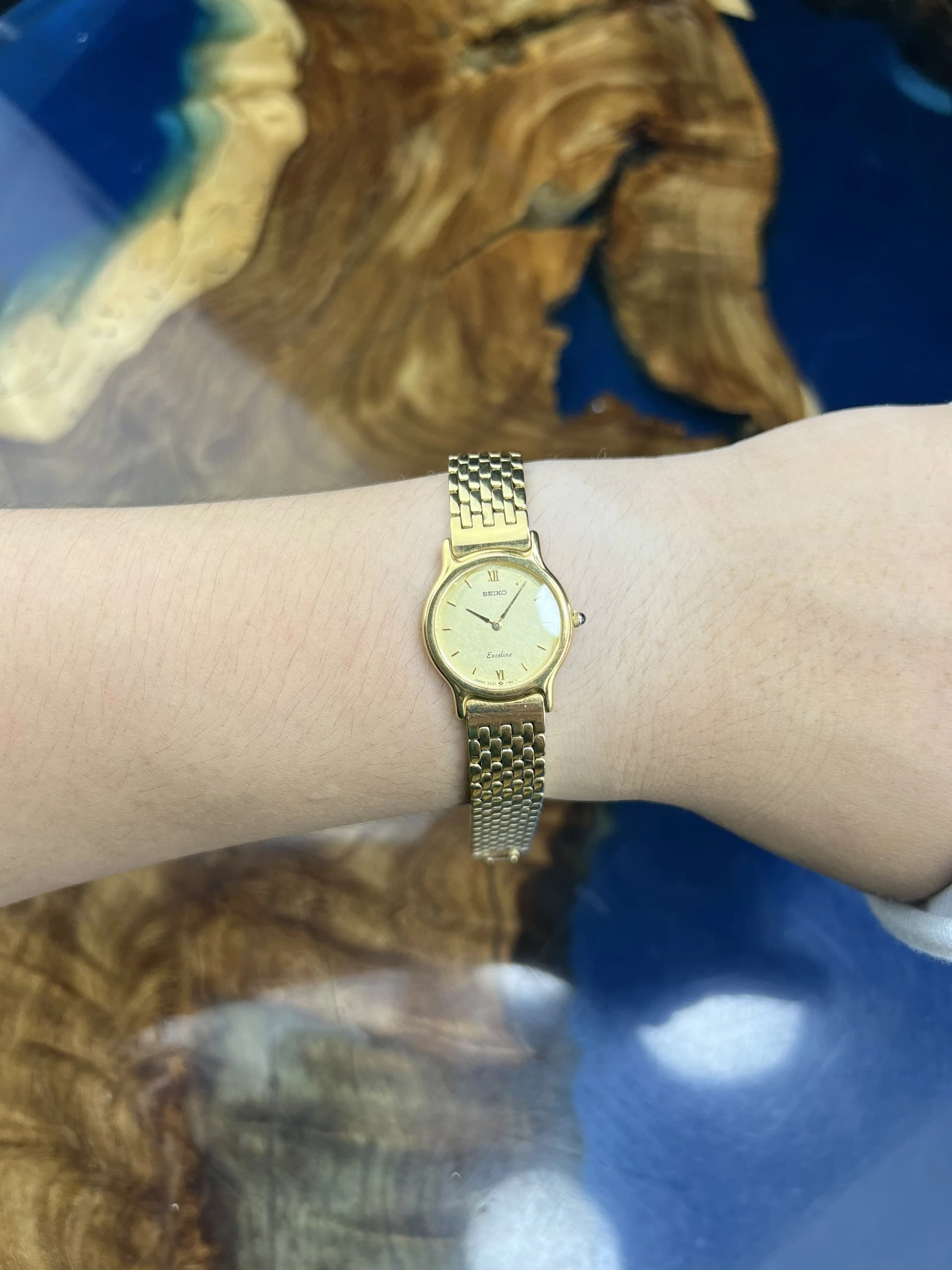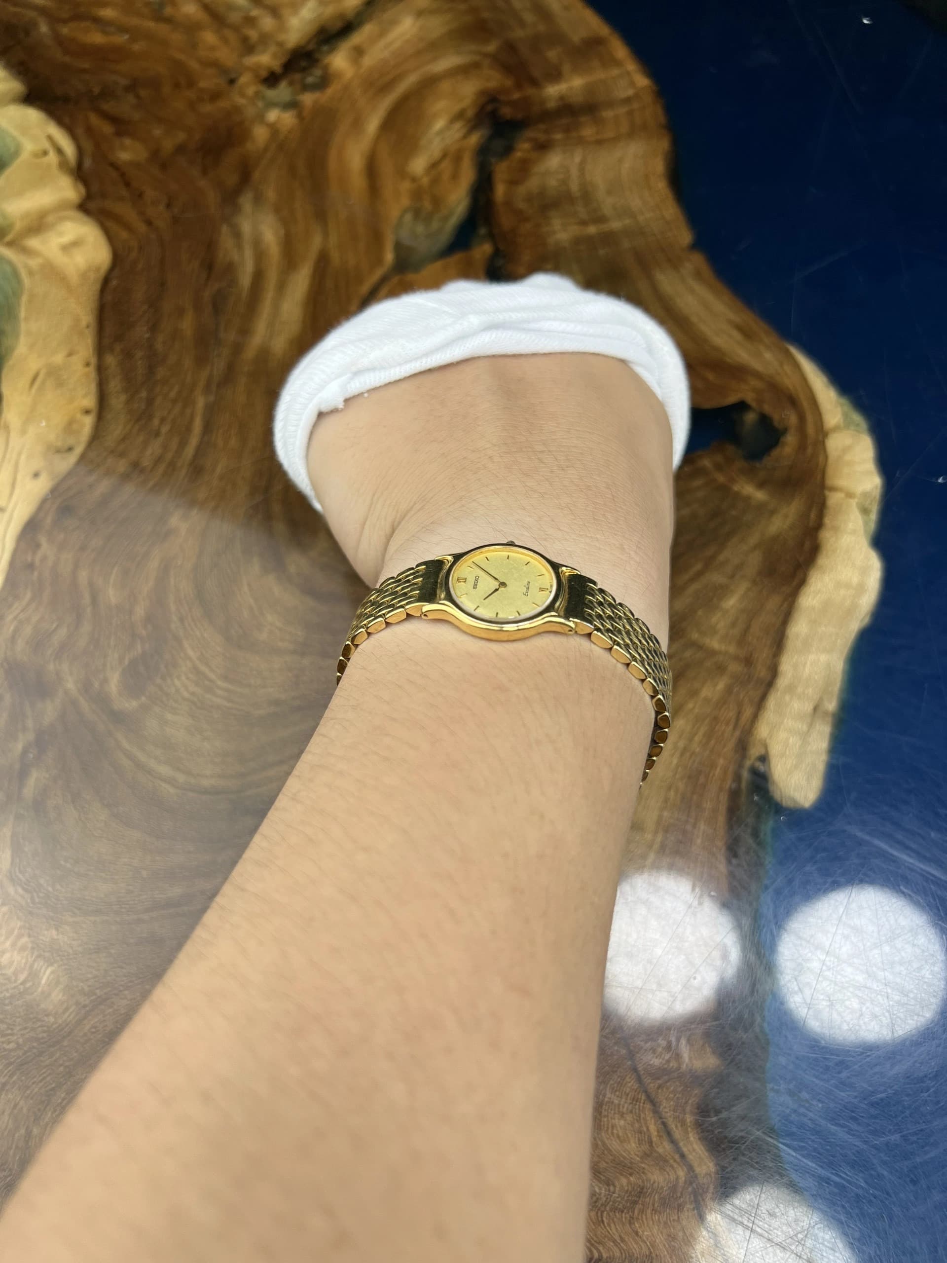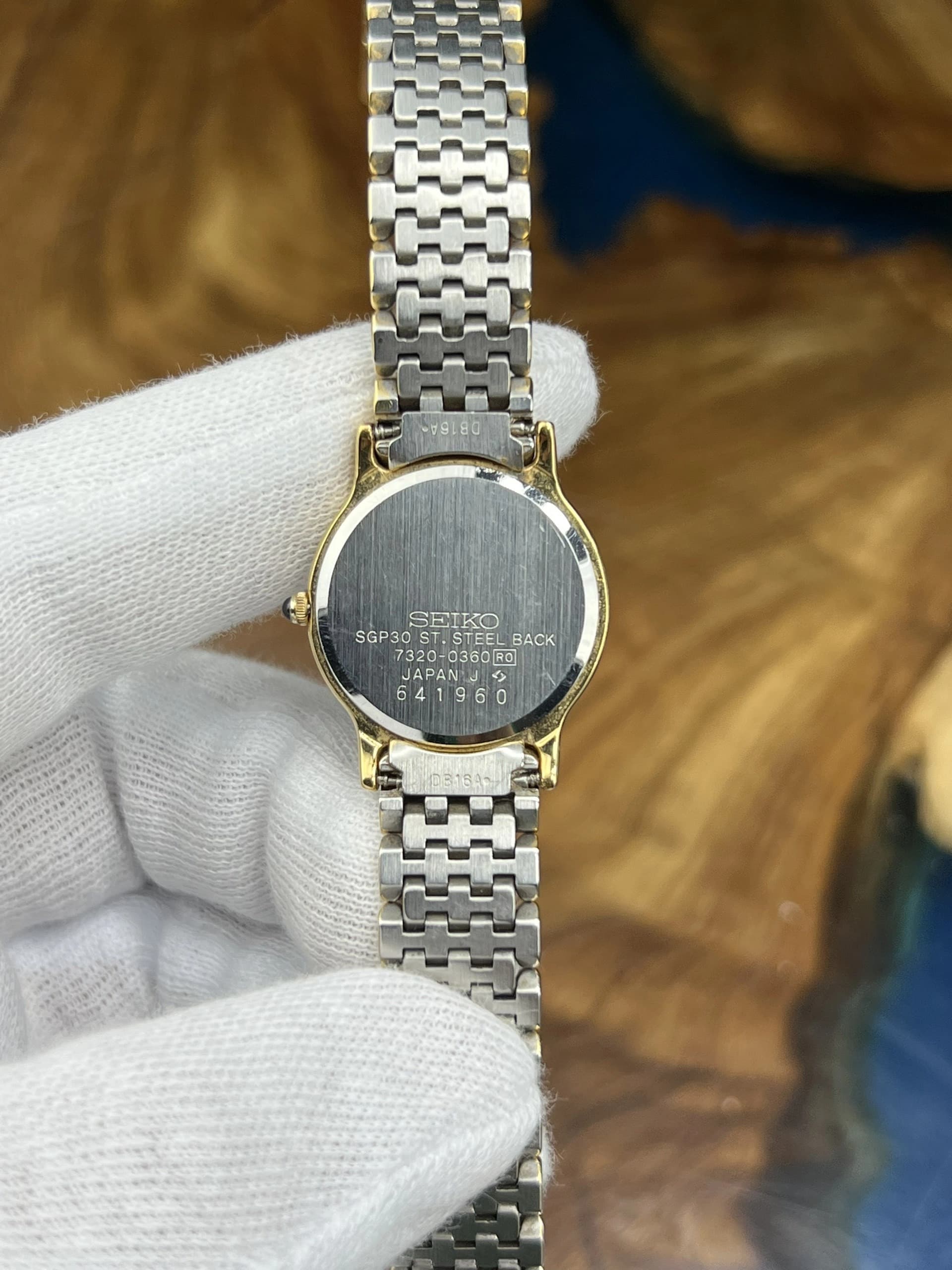 Experience refined craftsmanship with the Seiko Spirit chronograph, featuring a pristine white dial adorned with gold tone baton markers and hands. The 40mm stainless steel case, finished in brushed and polished surfaces, is complemented by a striking gold tone tachymeter bezel and a sleek silver metal bracelet with folding clasp. This quartz-powered timepiece offers precise chronograph functionality, a date window nestled between 4 and 5 o'clock, and robust 100-meter water resistance. • Case Diameter: 40mm • Movement: Quartz with Chronograph and Date complications • Dial: White with gold tone baton hour markers and three subdials • Bezel: Gold tone tachymeter • Strap: Silver tone metal bracelet with folding clasp • Crystal: Durable mineral glass This pre-owned watch is in very good condition, showing only minor hairline scratches, ready to elevate any collection with its blend of sporty elegance and reliable performance.